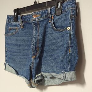 These blue jean shorts feature a high-waisted design and rolled cuffs, offering a relaxed and casual style. The medium-wash denim gives them a classic look, perfect for warm weather outings.