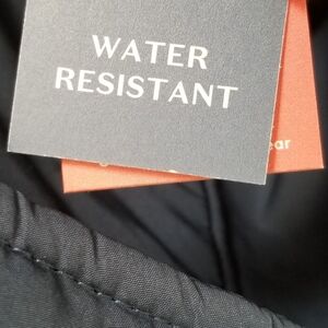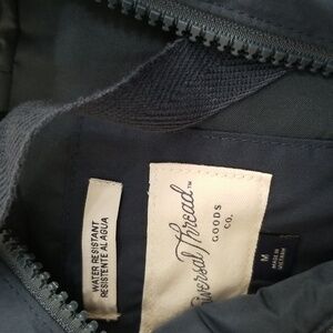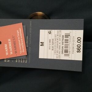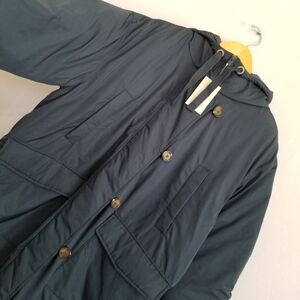 Stylish blue puffer jacket. Features a hood and button closure. Perfect for cold weather.