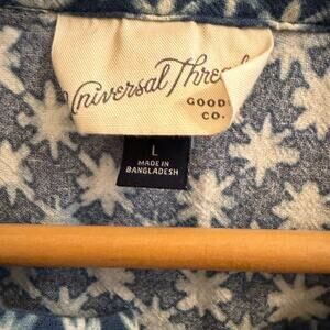 Blue and white star-print jumpsuit by Universal Thread in size L, featuring puff sleeves, button-front bodice, tie waist, and soft cotton-blend fabric. Flowy, casual-boho style perfect for spring and summer wear.