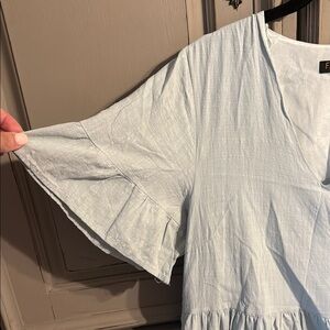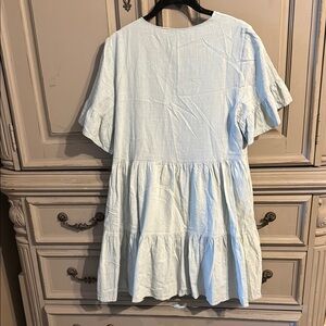 This light blue V-neck dress offers a relaxed fit with a tiered design, perfect for casual outings. Enjoy comfort and style in this versatile piece. Fully lined. Pockets! Ruffled sleeves. Loose fitting. Very flattering fit! Just above the knees.