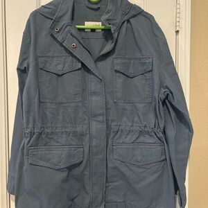 Casual utility jacket with a hood. Includes front pockets and adjustable waist. Perfect for everyday wear. Never worn