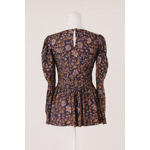 Embrace timeless cottagecore charm with this boho floral puff sleeve peplum blouse, crafted from a soft cotton-rayon blend. The rich navy base and warm rust floral pattern give it a vintage feel perfect for the fall and spring seasons.