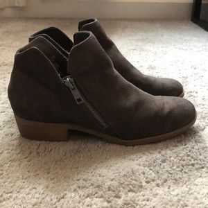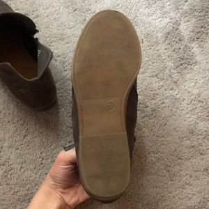 Brown suede like material with tan bottoms. Really good condition, only worn once! They unzip on both sides and can fold forward, so they are easy to get on and off (pictured)