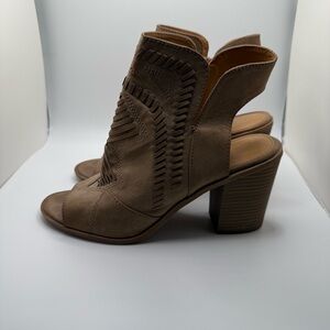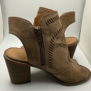 Stylish ankle booties with intricate stitching. Open-toe design. Comfortable fit.