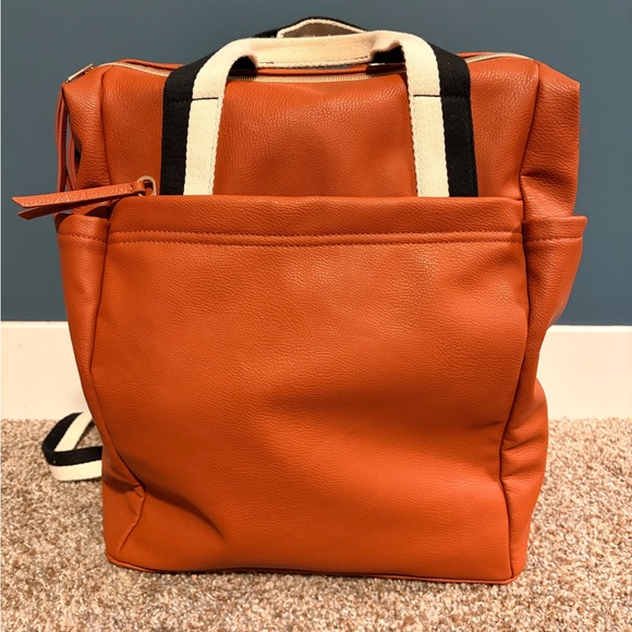 Chic brown backpack with sturdy handles. Ideal for everyday use. Features laptop sleeve that fits up to 15inch laptop.
