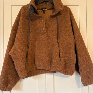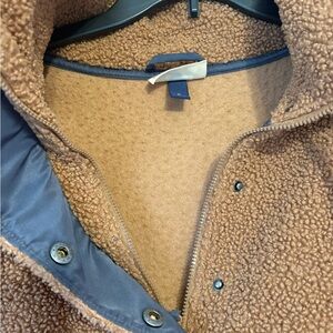 Cozy teddy jacket with a soft texture. Features a high collar and front pockets. Perfect for layering.
