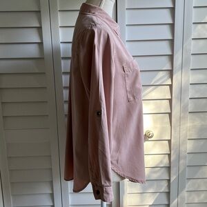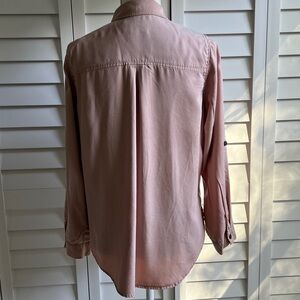 Dusty rose button up. Sleeves can be rolled up or left down with button closure on sleeve. Please note that there is a small snag on the back of the arm near shoulder as pictured.