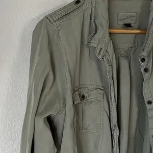 This top is a button up style. Olive green color. Great as an outer layer. Gently used condition. Size L.
