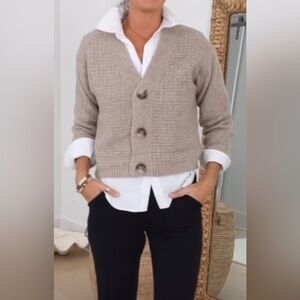 Cozy knit cardigan with large buttons. V-neck design for layering. Cropped, relaxed fit. Neutral beige tone works with many outfits.