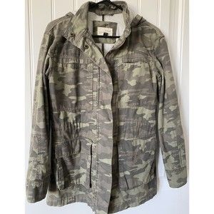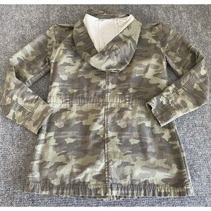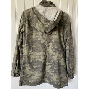 --STYLE: Mid length Green Camo Coat with drawstring inner waist, zip and snaps fully up front of jacket. Pockets and hood. --BRAND: Universal Thread --SIZE: XSmall --MEASUREMENTS: See photos --MATERIAL: Cotton --SHIPPING: We ship in one business day. --OTHER DETAILS: Smoke free home. We love to answer any and all questions.