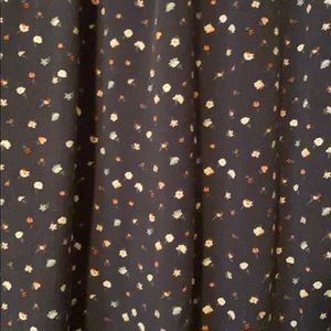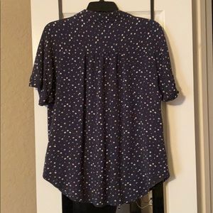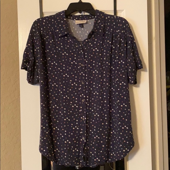 Navy blue short sleeve button up shirt with floral print and cuffed short sleeves.