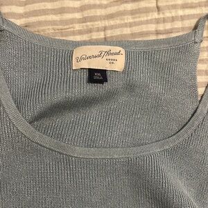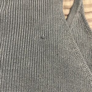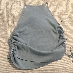 Light blue sweater tank that cinches on the side. Super soft. A few small pulls in the sweater