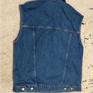 Denim vest with button closure. Sleeveless and versatile. Perfect for layering.
