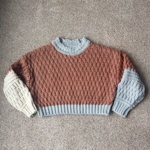 Cropped color block design. Chunky knit. Perfect for casual wear.