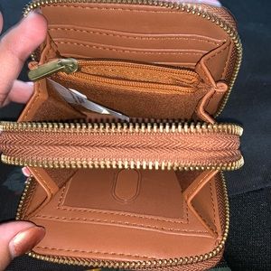 Cute brown compact wallet! Comes with 6 card inserts and an ID card slot. Great for smaller purses. I used it once for when I went to Costa Rica! But it’s still like new.