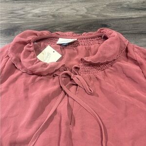 Stylish coral top with ruffled neckline. Ideal for versatile wear.