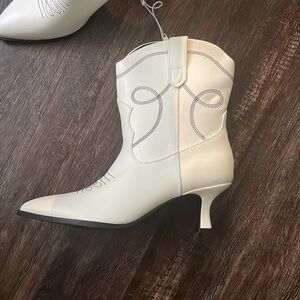 Chic cream ankle booties with elegant stitching. Perfect for any occasion.
