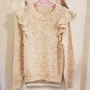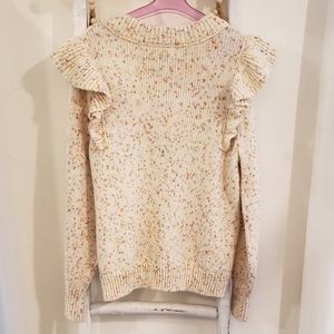 Pretty feminine cream sweater with multi-colored confetti pattern and ruffled detailing on shoulders. Gently used, size M
