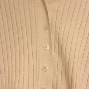 Button-up front. Long sleeve. The lighting does make it look cream but it is a full white cardigan. Feel free to message me with any questions!!