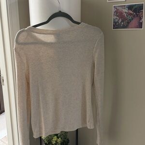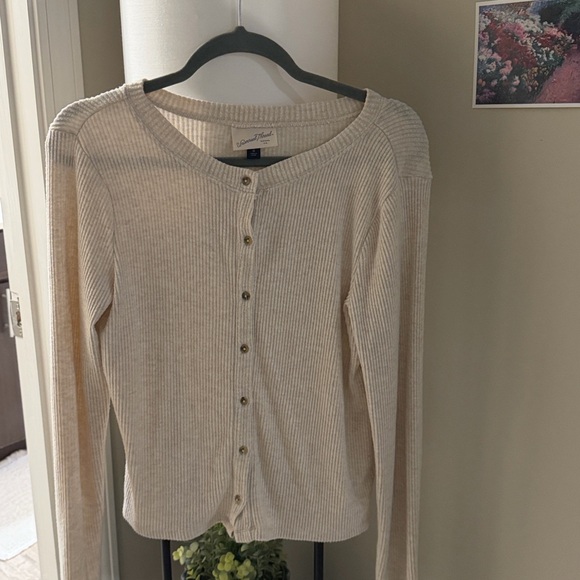 Elegant cream cardigan with ribbed texture. Features button-up design.