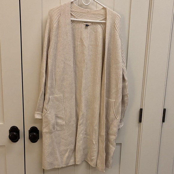 Elegant cream cardigan with ribbed texture. Open-front design. Ideal for layering.