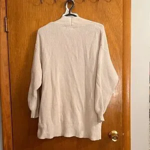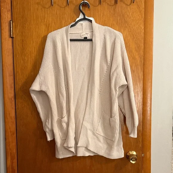 Cream ribbed open-front cardigan with relaxed fit. Features front pockets and long sleeves. Soft lightweight knit for layering.