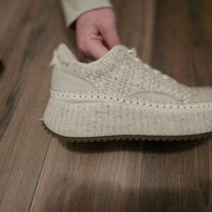 Stylish cream sneakers with textured design. Lace-up closure. Comfortable and trendy.