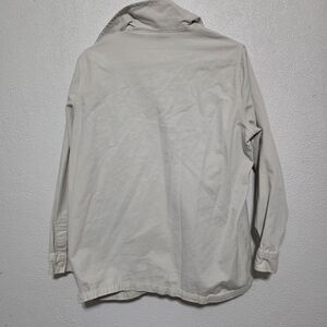 White utility jacket with button front. Includes spacious front pockets. Perfect for casual wear.