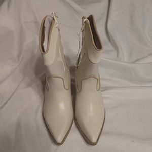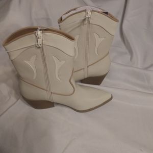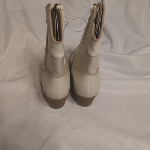 Chic cream heeled western boot with pointed toe. Braided side detail and subtle stitched accents. Block wooden heel for steady wear. Smooth leather-like finish for a polished look. Bought for my daughter to wear to an event and she has since outgrown. Just worn a couple times.