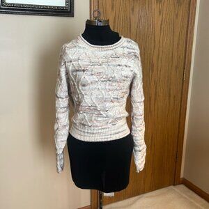 Stylish and cozy pullover, featuring a textured open cable knit pattern has a classic crew neck and a neutral palette, blending soft beige with subtle hints of peachy pink / coral and brown. Pair this fun and flirty unique sweater with jeans or leggings. Perfect for casual outings in cooler months.