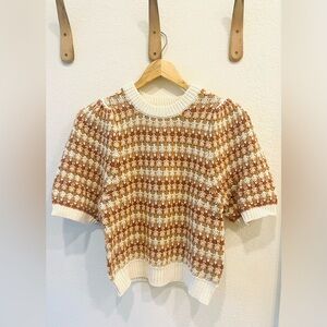 Description: Chic textured sweater featuring multi colored stripe in a mix of warm neutrals. Finished with elbow length puff sleeves and solid ribbed trim at neck, waist and cuff.