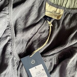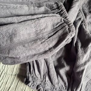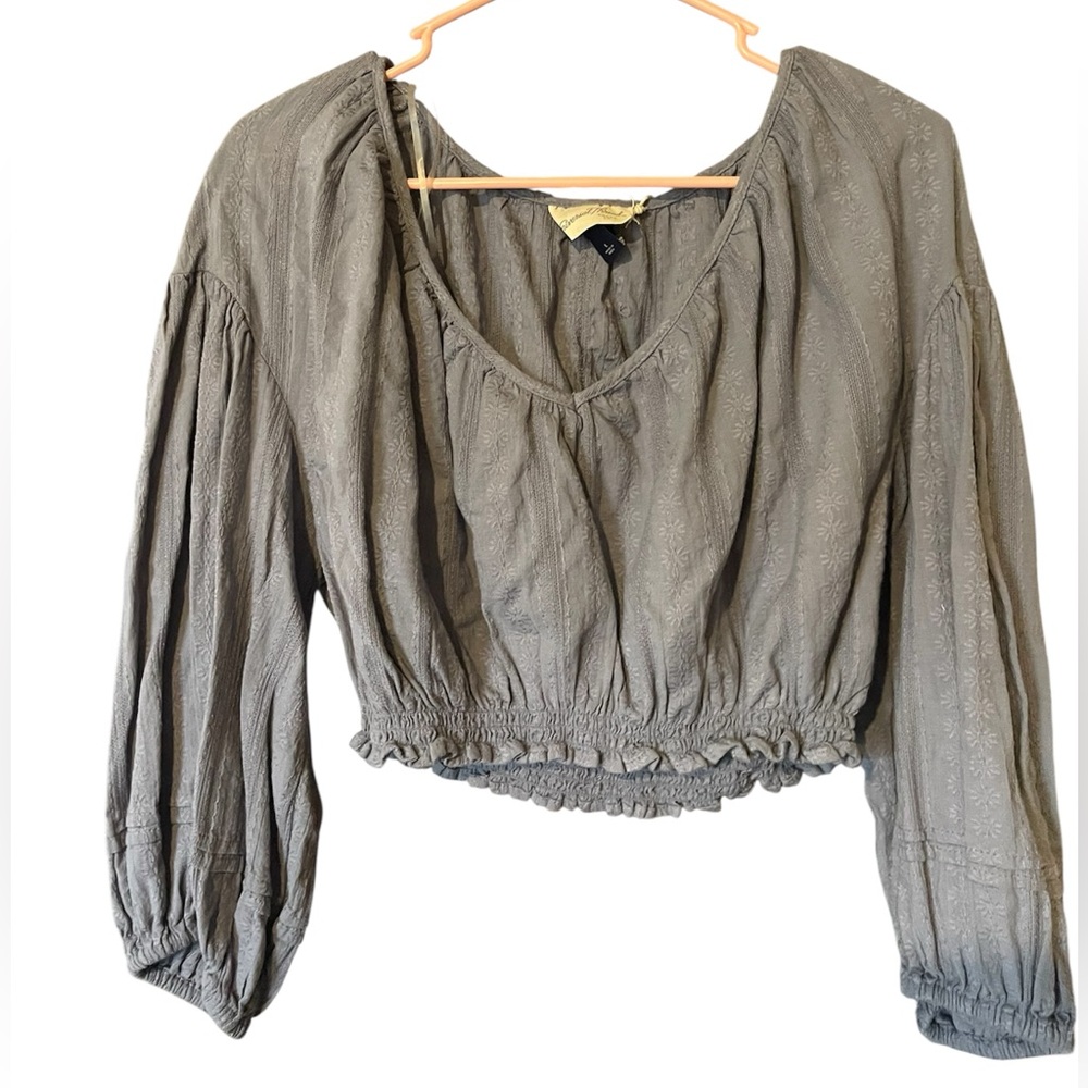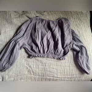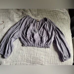 blueish gray blouse with a relaxed fit. features a v-neck and gathered hem. cropped. size L.