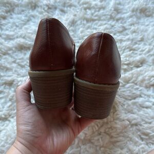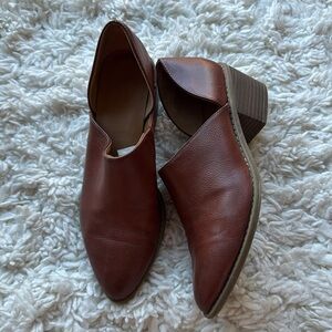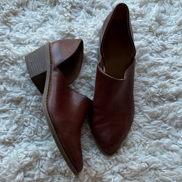 These booties are a vegan leather. Medium brown color and D’Orsay style. Gently used condition. Size 9.