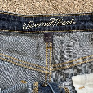 Stylish dark blue jean shorts. Features button fly and frayed hem. Perfect for casual wear.