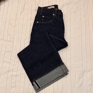 Stylish dark blue jeans. Classic design with rolled cuffs. Perfect for casual wear.