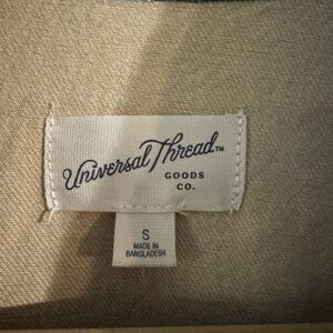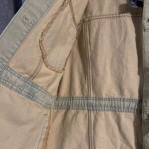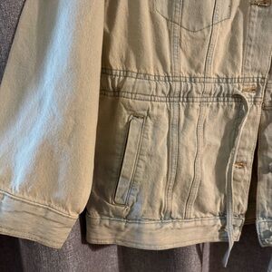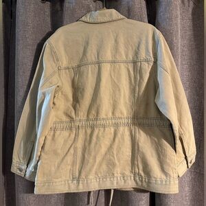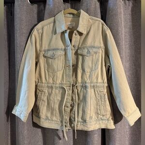 Stylish vintage wash cinched denim jacket with button front, four pockets and drawstring waist.