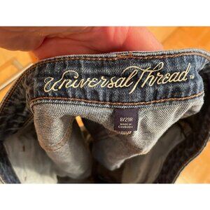 These Universal Thread denim shorts in size 8/29R feature a raw hem, button fly closure, and a classic blue wash. Made with durable material and designed for comfort.