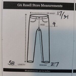 Waist = 17 inches, Rise = 9 inches, Inseam = 27 inches, Length = 38 inches.