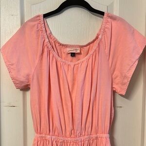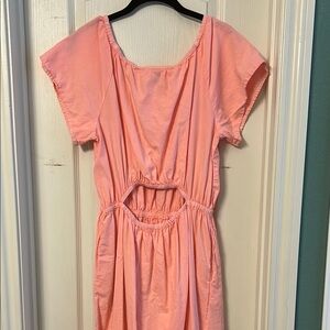 Pastel pink color. Round neck with short sleeves. Stretchy band at the waist. Small opening on the back side. Has pockets. Perfect, lightweight dress for spring/summer. Worn a couple of times. Midi length.