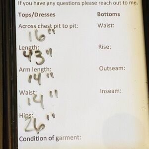 16" armpit to armpit, 43" length, 24" arm length, 14" waist