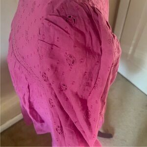 Elegant pink blouse with intricate embroidery. Features long sleeves and a flowing design. Measurements: Overall length is approximately 25”, pit to pit is approximately 20” and sleeve length measured from pit is approximately 16 1/2”. Women’s size XXL.