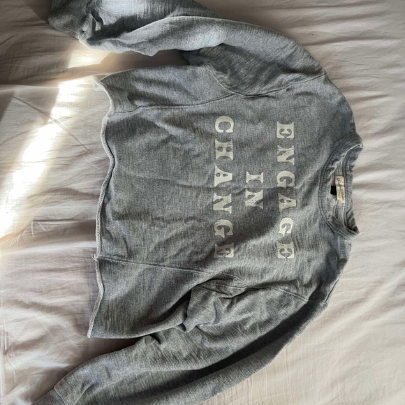 Grey sweater with "Engage In Change" writtenen on the front.