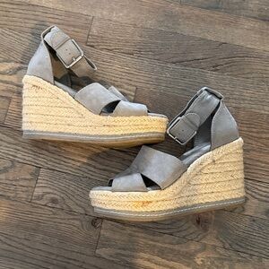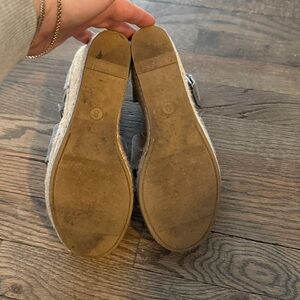Ankle strap, grey espadrilles. Surprisingly comfortable. Minimal wear. See last picture….glue residue from production.