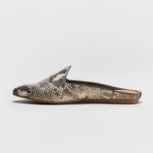 Universal Thread slip-on mules with animal print can easily pair with a range of looks Flat construction and notched uppers offer comfortable wear Pointed toe creates a polished finishing touch
