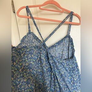 Stylish dress with a vibrant floral design. Ideal for everyday wear. Features cross-back style. Has pockets!