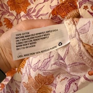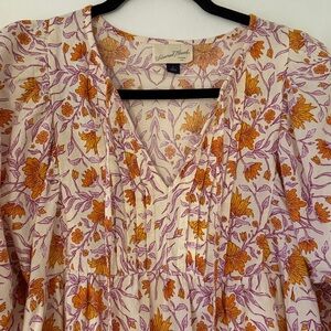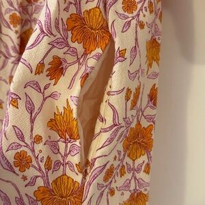 Elegant v-neck dress with floral design. Features soft orange and purple hues. Has pockets!!! VGUC.
