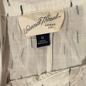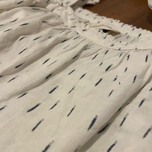 Universal Thread, white with small blue stripes. Ties on the shoulder, very flowy, very comfy!