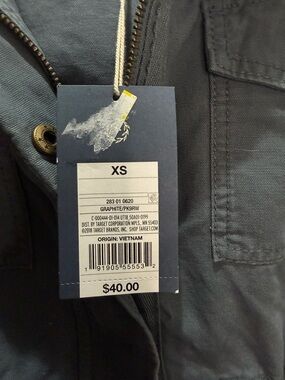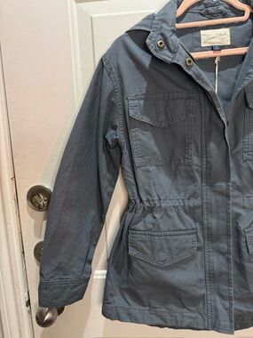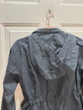 Classic utility jacket by Universal Thread. Features front flap pockets and a drawstring waist. Hood with snap closures. Zipper and snap front closure. Versatile for everyday wear. Graphite color is a grey-ish blue.