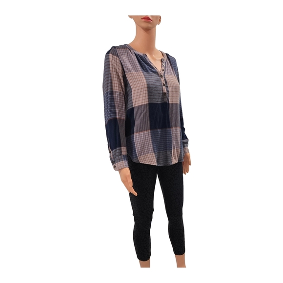 This Universal Thread blouse features a relaxed fit with a stylish mandarin collar and long sleeves, perfect for a casual yet polished look. The gray color adds a versatile touch, making it easy to pair with various outfits. Its buttoned design enhances the overall style, offering both comfort and elegance.