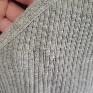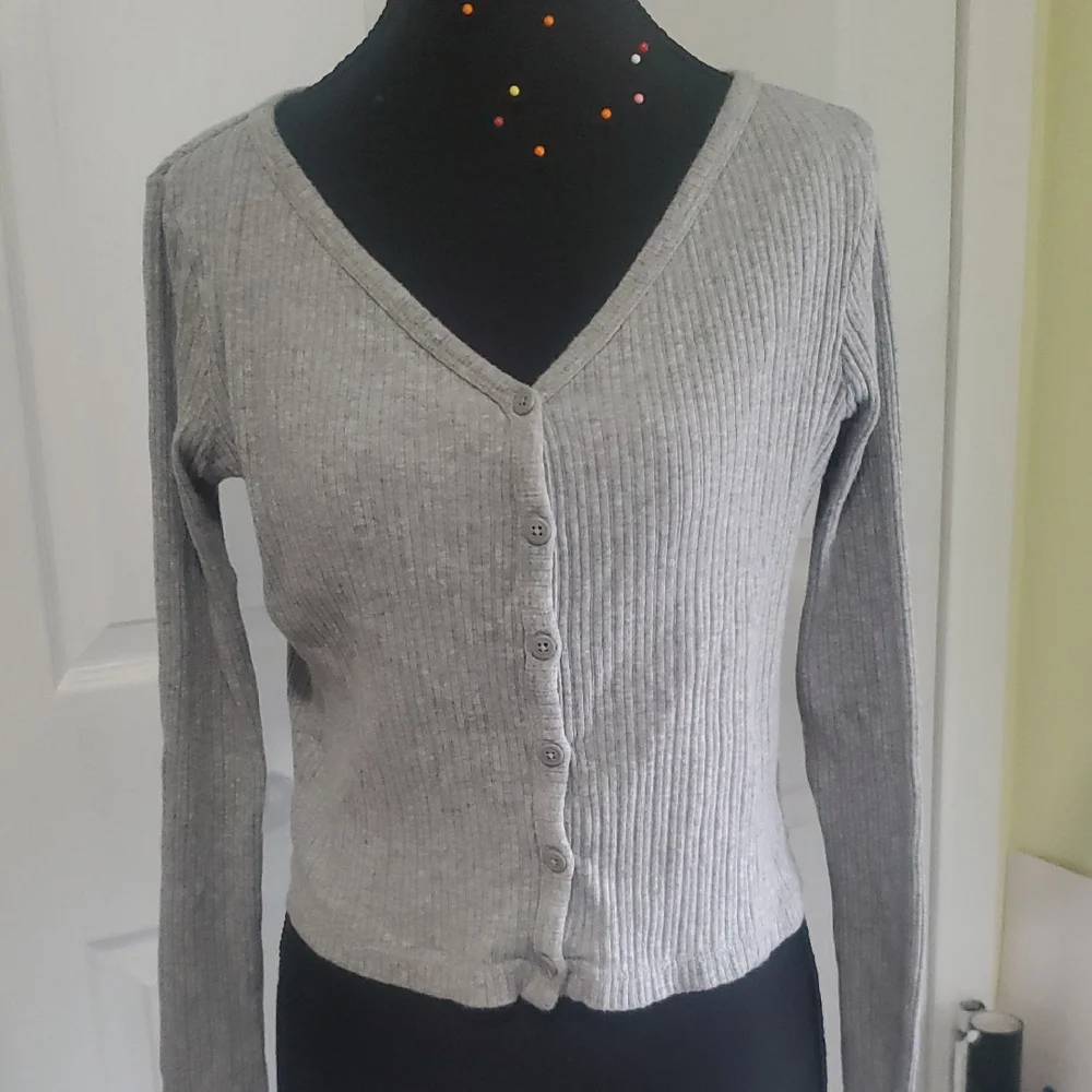 Stylish gray ribbed cardigan. V-neck with button closure. Long sleeves. Perfect for layering.